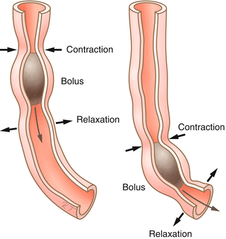 When the bolus enters the esophagus the longitudinal muscles contract and push the bolus forwards and down the esophagus